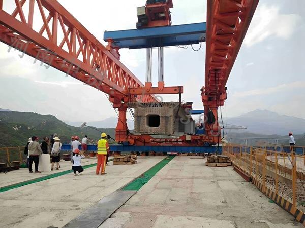 提梁:前后两台天车同步起吊箱梁,缓慢前移。